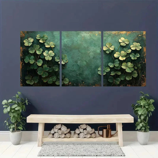 3pcs Vibrant Green Shamrock Design Oil Painting Metal Print Ready to Hang Art