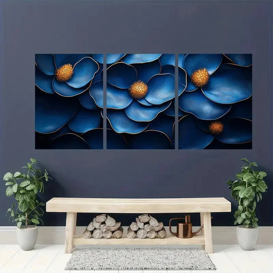 3pcs Vibrant Blue & Pink Floral Design Metal Print Ready to Hang Art