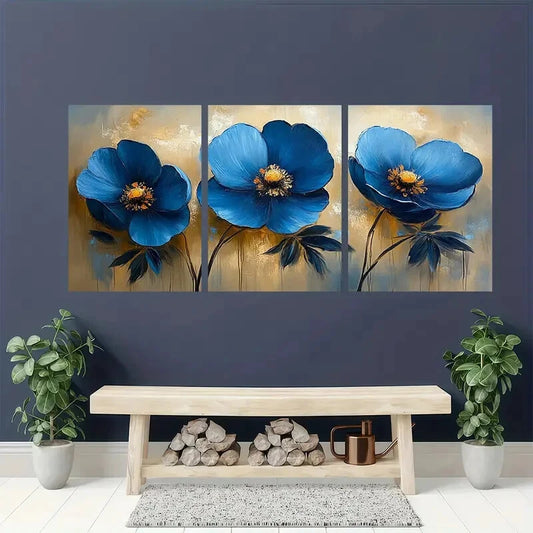 3pcs Abstract Blue Floral Flower Oil Painting Metal Print Ready to Hang Art
