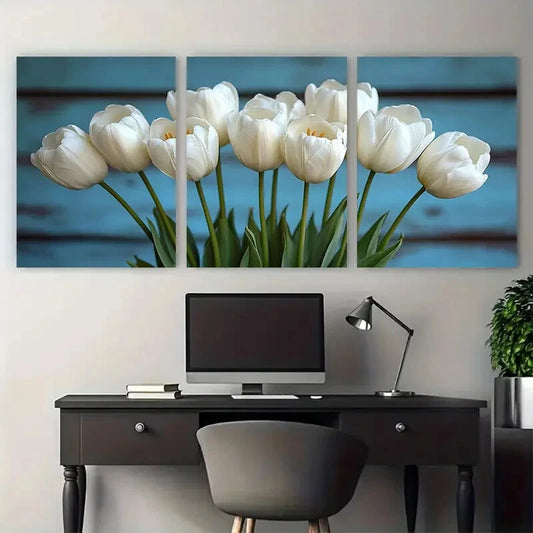 3pcs Elegant White Tulips with Leaves Illustration Metal Print Ready to Hang Art
