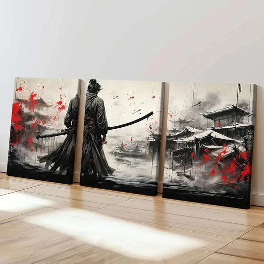 3pcs Japanese Style Sakura Tree Samurai Wall Art Set Canvas Framed 40x60cm - High Quality Print 100% Australian Made Wall Canvas Ready to Hang
