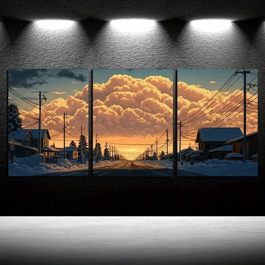 3pcs Scenic Village Winter Sunset Landscape Metal Print Ready to Hang Art