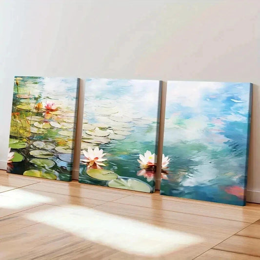 3pcs Abstract Lotus Pond And Flowers Wall Art Set Canvas Framed 40x60cm - High Quality Print 100% Australian Made Wall Canvas Ready to Hang
