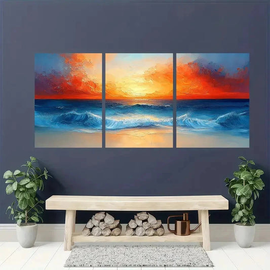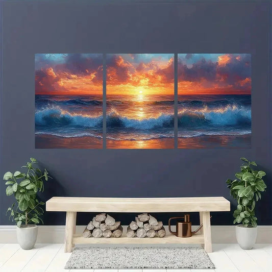3pcs Vibrant Sunset Seascape Blue & Orange Ocean Metal Print Ready to Hang Art