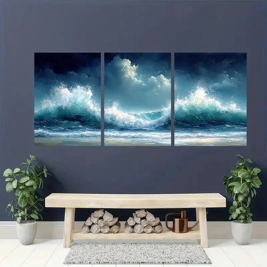 3pcs Stormy Ocean Seascape Watercolor Waves Metal Print Ready to Hang Art