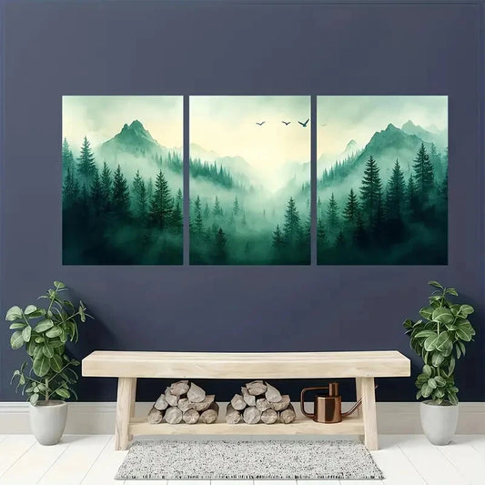 3pcs Pine Tree Forest Watercolor Landscape Art Metal Print Ready to Hang Art