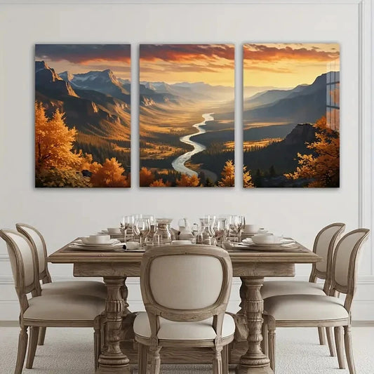 3pcs Stunning Mountain Peaks Forest River Sunset Metal Print Ready to Hang Art