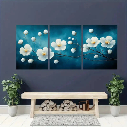 3pcs Elegant White Flower Dark Blue Background Metal Print Ready to Hang Art