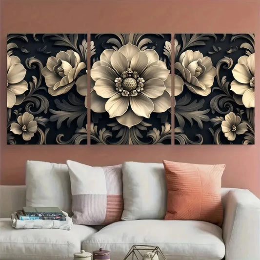 3pcs Elegant Dark Floral Baroque Damask Pattern Metal Print Ready to Hang Art