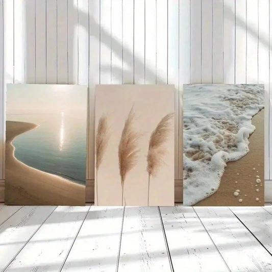 3pcs Beach Scenes Pampas Grass And Waves Metal Print Ready to Hang Art