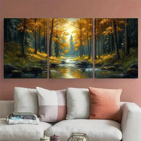 3pcs Forest of Trees with a River Landscape Metal Print Ready to Hang Art