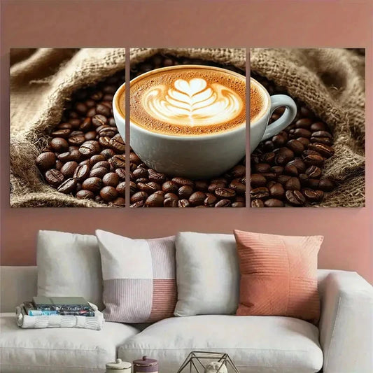 3pcs Latte on Coffee Sack Surrounded by Beans Metal Print Ready to Hang Art