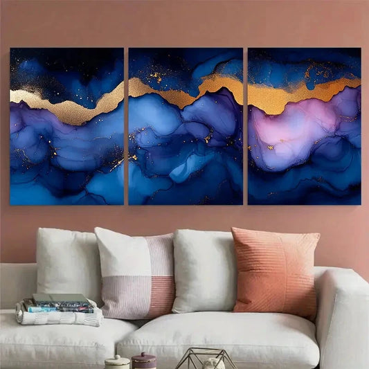 3pcs Abstract Marbling in Blue Purple Golden Metal Print Ready to Hang Art