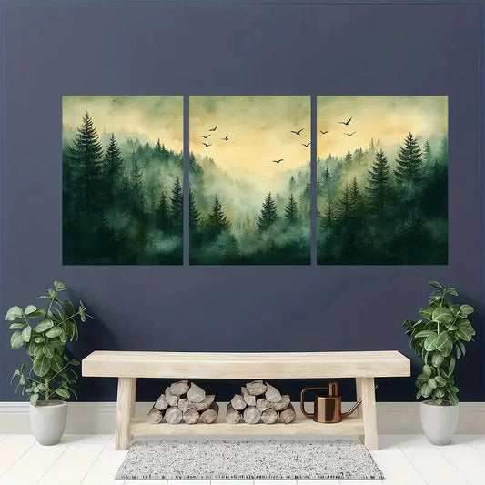 3pcs Pine Tree Forest Watercolor Landscape Art Metal Print Ready to Hang Art