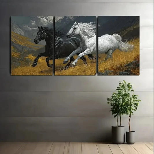 3pcs Galloping Black & White Horses in Valley Metal Print Ready to Hang Art