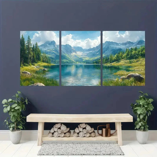 3pcs Pine Tree Forest Lake Landscape Minimalist Metal Print Ready to Hang Art