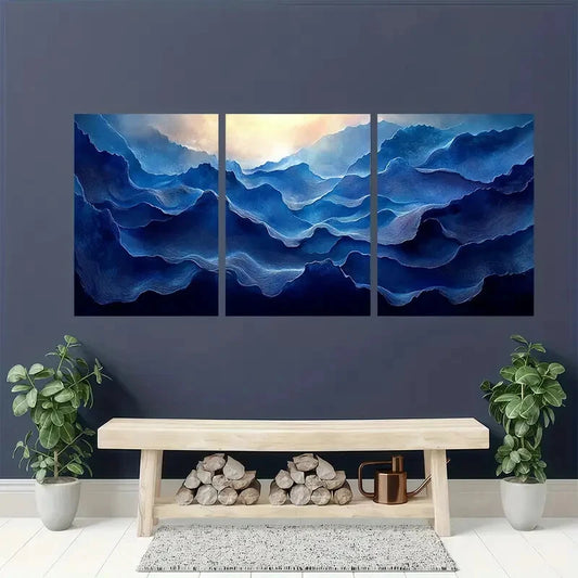 3pcs Wave Design in Indigo & Honeycomb Tones Metal Print Ready to Hang Art