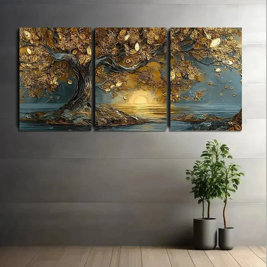 3pcs Tree with Leaves Golden and Silvery Metal Print Ready to Hang Art