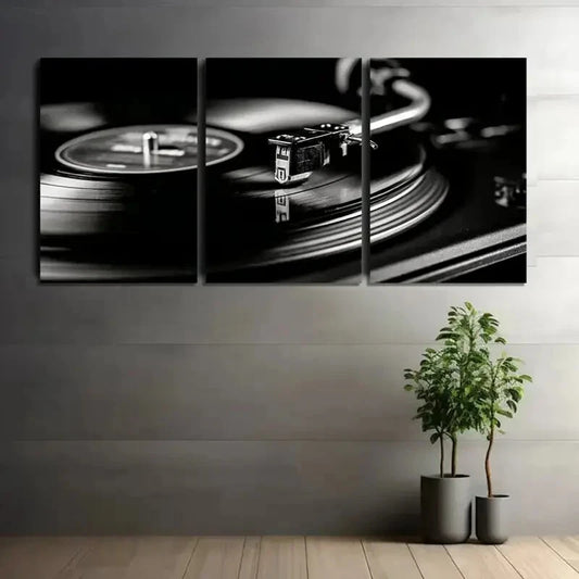 3pcs Vintage Vinyl Record Player Black and White Metal Print Ready to Hang Art
