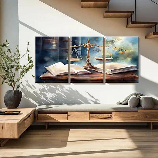 3pcs Golden Scales & Open Books Lawyers Office Wall Art Set Canvas Framed 40x60cm - High Quality Print 100% Australian Made Wall Canvas Ready to Hang