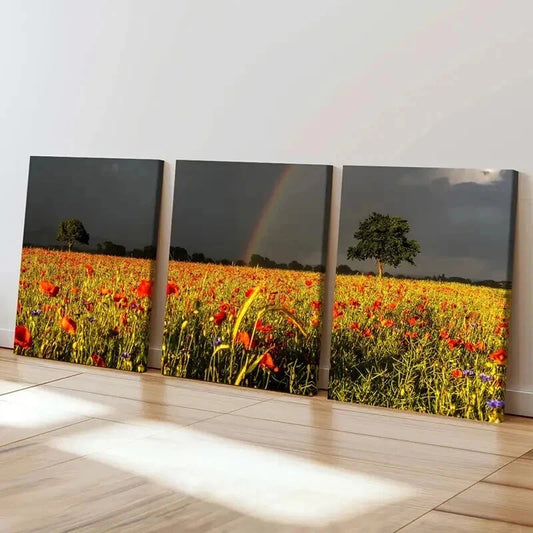 3pcs Vibrant Flower Field & Rainbow Landscape Wall Art Set Canvas Framed 40x60cm - High Quality Print 100% Australian Made Wall Canvas Ready to Hang