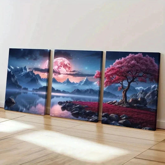 3pcs Red Moon Tree Mountains & Lake Wall Art Set Canvas Framed 40x60cm - High Quality Print 100% Australian Made Wall Canvas Ready to Hang