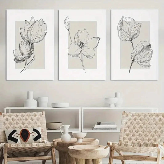 3pcs Beige Simple Floral Painting Wall Art Metal Print Ready to Hang Art
