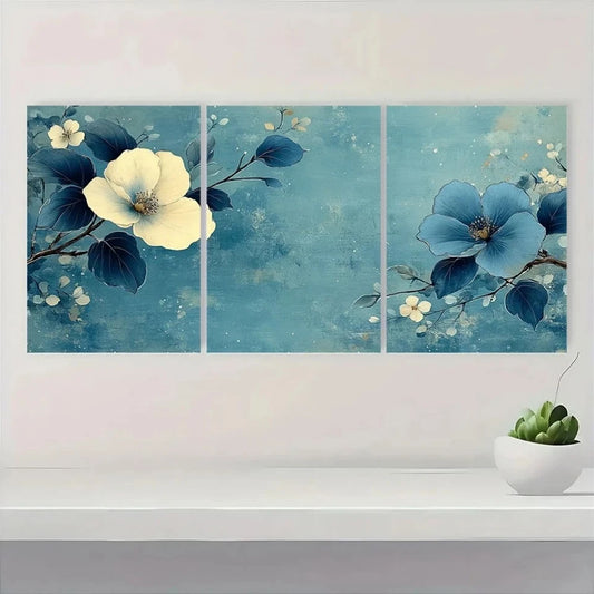 3pcs Abstract Vibrant Blue White Floral Metal Print Ready to Hang Art