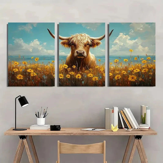 3pcs Rustic Highland Cow & Dandelions Decor Metal Print Ready to Hang Art
