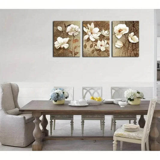 3pcs Modern Elegant Golden & White Floral Metal Print Ready to Hang Art