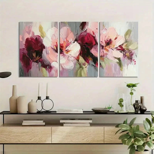 3pcs Abstract Floral Painting in Pink-Burgundy Metal Print Ready to Hang Art