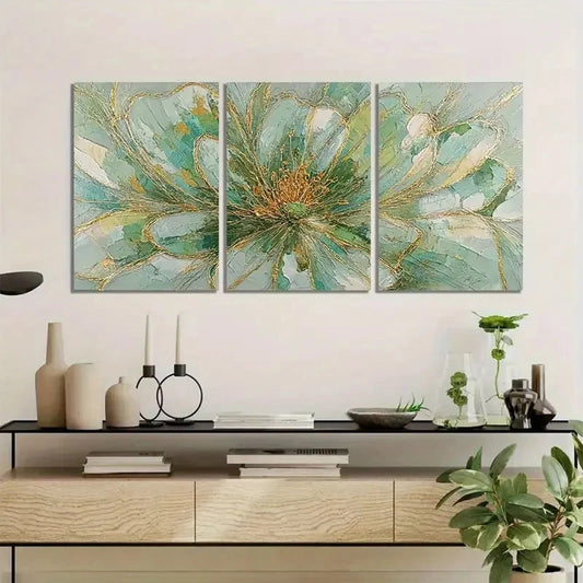 3pcs Flower with Light Green-Golden and Golden Metal Print Ready to Hang Art
