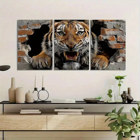 3pcs Tiger Breaking Through Brick Wall Metal Print Ready to Hang Art