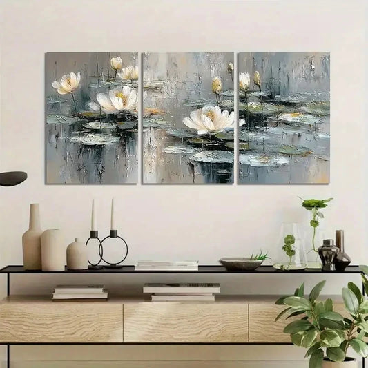 3pcs White for Lotus Pond with Soft Gray Tones Metal Print Ready to Hang Art