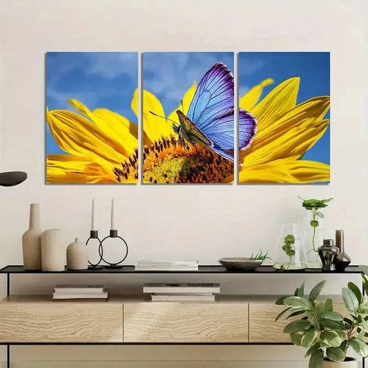 3pcs Butterfly On a Sunflower Nature Scene Metal Print Ready to Hang Art