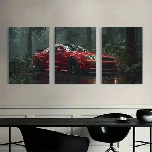 3pcs Red Nissan Skyline GT-R in Rain Paintings Metal Print Ready to Hang Art
