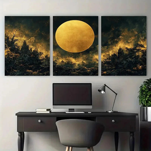 3pcs Abstract Golden Circle with Dark Floral Shape Metal Print Ready to Hang Art