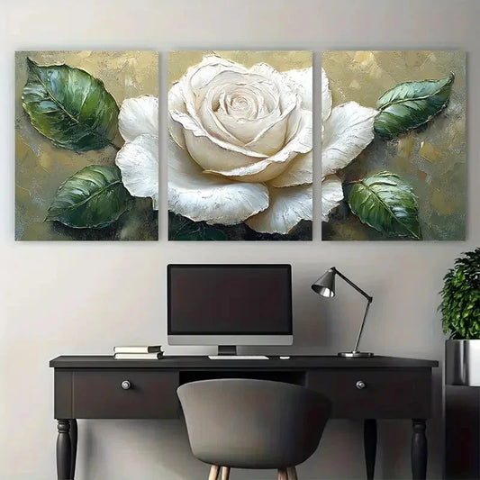 3pcs White Rose with Green Leaves Modern Spring Metal Print Ready to Hang Art