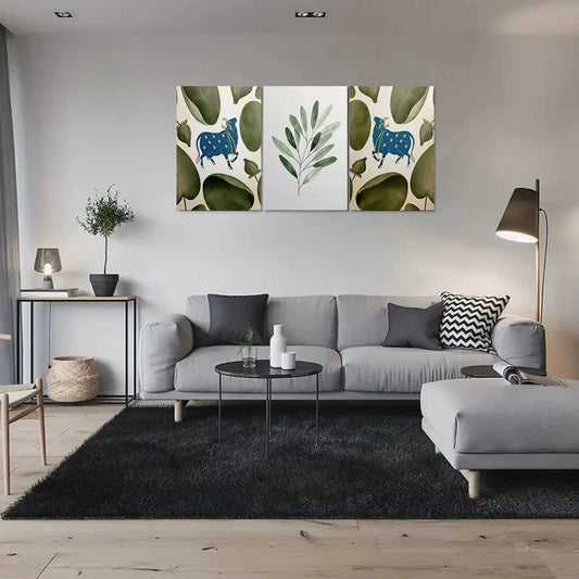 3pcs Blue Bull & Green Leaves Metal Print Ready to Hang Art