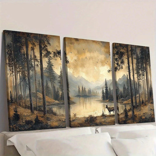 3pcs Neutral Brown Forest Scene with Serene Wall Art Set Canvas Framed 60x90cm - High Quality Print 100% Australian Made Wall Canvas Ready to Hang