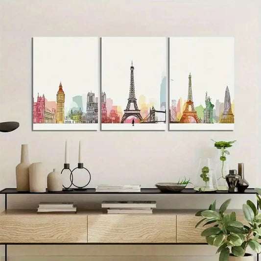 3pcs Skyline of Famous Landmarks Painting Metal Print Ready to Hang Art