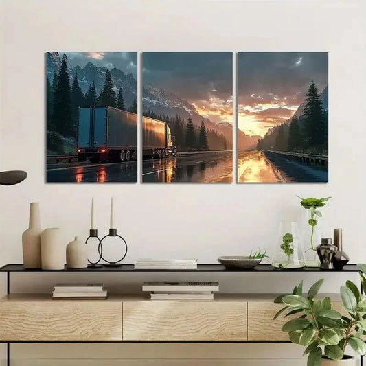 3pcs Semi-Truck Driving on Highway with Mountains Metal Print Ready to Hang Art