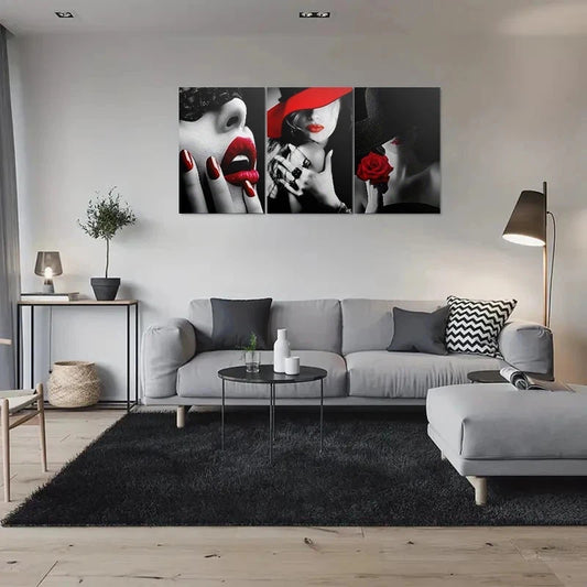 3pcs Red Lipstick and Rose Modern Black and White Metal Print Ready to Hang Art