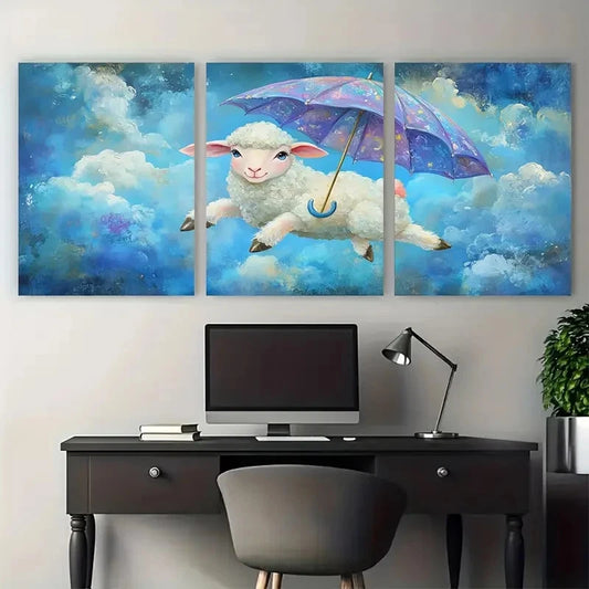 3pcs Flying Sheep with Umbrella Whimsical Design Wall Art Set Canvas Framed 40x60cm - High Quality Print 100% Australian Made Wall Canvas Ready to Hang