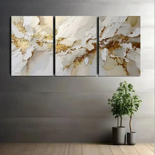 3pcs White & Golden Textured Flowing Abstract Metal Print Ready to Hang Art