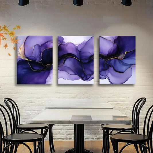 3pcs Flowing Purple Watercolor with Golden Veins Metal Print Ready to Hang Art