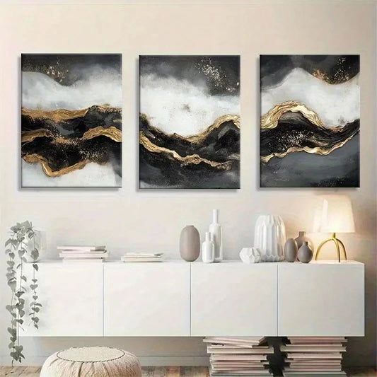 3pcs Abstract Golden and Black Wave Flowing Design Metal Print Ready to Hang Art