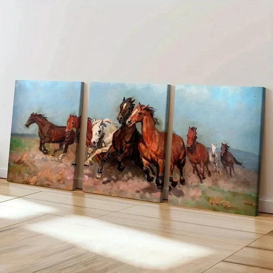 3pcs Vintage Running Horses Decoration Wall Art Set Canvas Framed 40x60cm - High Quality Print 100% Australian Made Wall Canvas Ready to Hang