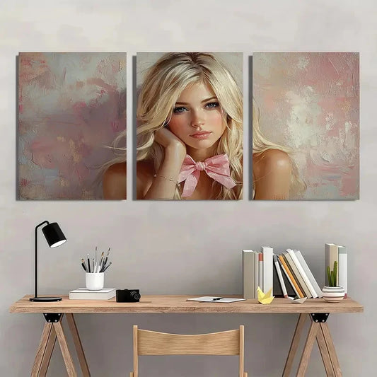 3pcs Blonde Girl Coquette Pink Bow Perfect Wall Art Set Canvas Framed 40x60cm - High Quality Print 100% Australian Made Wall Canvas Ready to Hang