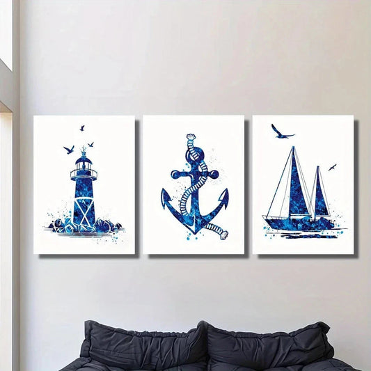 3pcs Navy Blue Lighthouse Sailboat Anchor Metal Print Ready to Hang Art